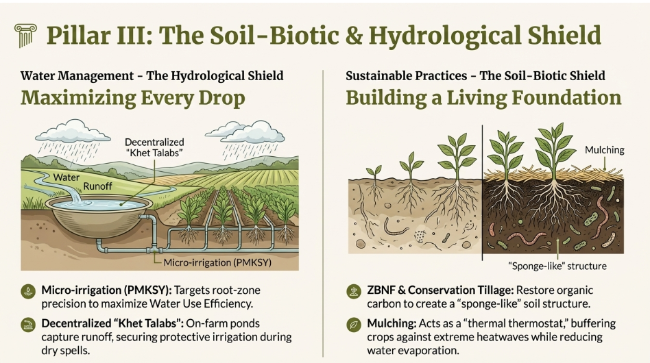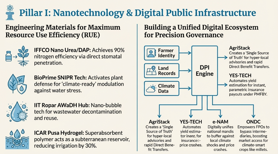 Policy aims and objectives: Shifting the focus from “production at any cost” to “sustainable profitability,” integrating recent frameworks like BioE3 and established missions like NMSA to drive climate adaptation.