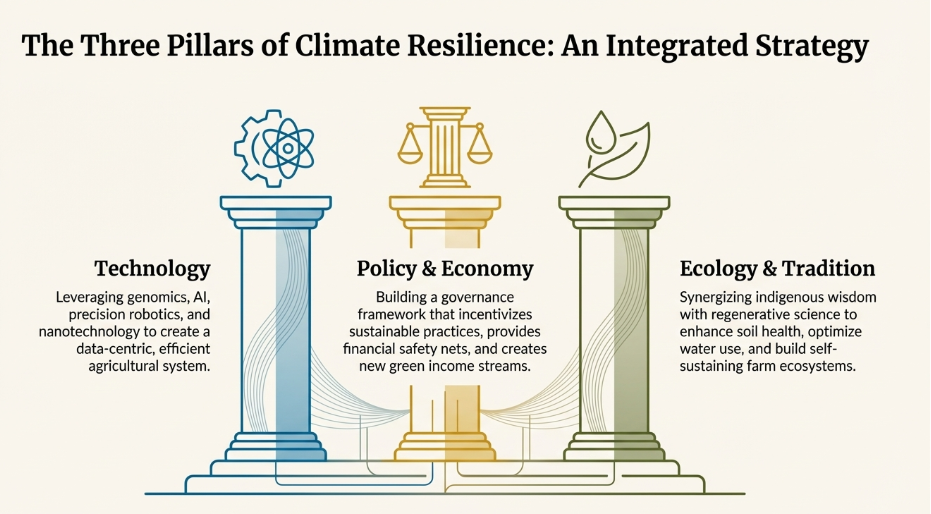 “Climate resilient agriculture integrates genomic analysis, biotechnology, and AI with adaptive policy to navigate climate change dynamics. This framework secures food supply and elevates farmer incomes, balancing economic growth with environmental conservation through data-driven best practices.”