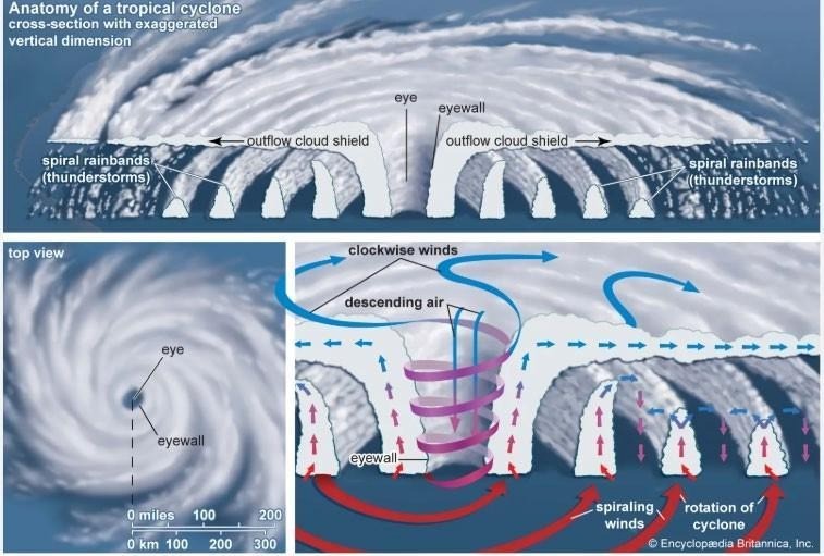 In meteorological terms, a cyclone forms when warm, moist air rises from the ocean surface, creating an area of low pressure beneath. Surrounding air rushes in to fill the void, also heating and rising — setting off a self-sustaining convective system of towering cumulonimbus clouds, thunderstorms, and strong winds.
